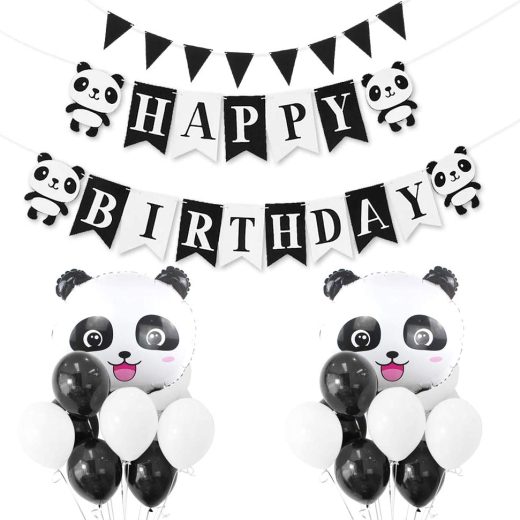 Aluminum,Felt,Latex A set of birthday party decorations supplies includes 1 felt HAPPY BIRTHDAY panda banner,1 triangle flag banner,2 cute panda aluminum foil balloons,10 white and 10 black latex balloons. Come with 2 rope for the banners,make you easy to string together and hanging it up. Made of durable material,and balloons will stay inflated for days and all of items are reusable. Perfect decorations for holding a panda themed birthday party for baby shower,panda lovers or kids birthday. Use double-sided adhesive to stick this cute decorations set to the wall or everywhere,add fun atmosphere for the birthday party.