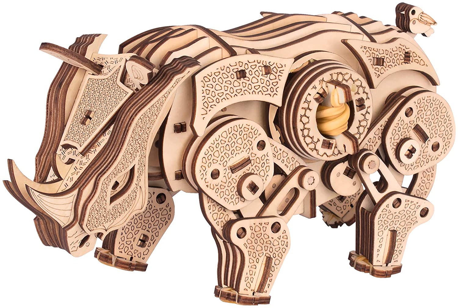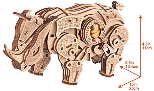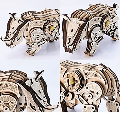 Bitopbi 3D Wooden Puzzles Rubber Gears Linkage Design Laser Engraving DIY Safe Assembly Constructor Kit Toy for Teens and Adults Animal Mechanical 3-D Models for Self-Assembly (Rhinoceros)