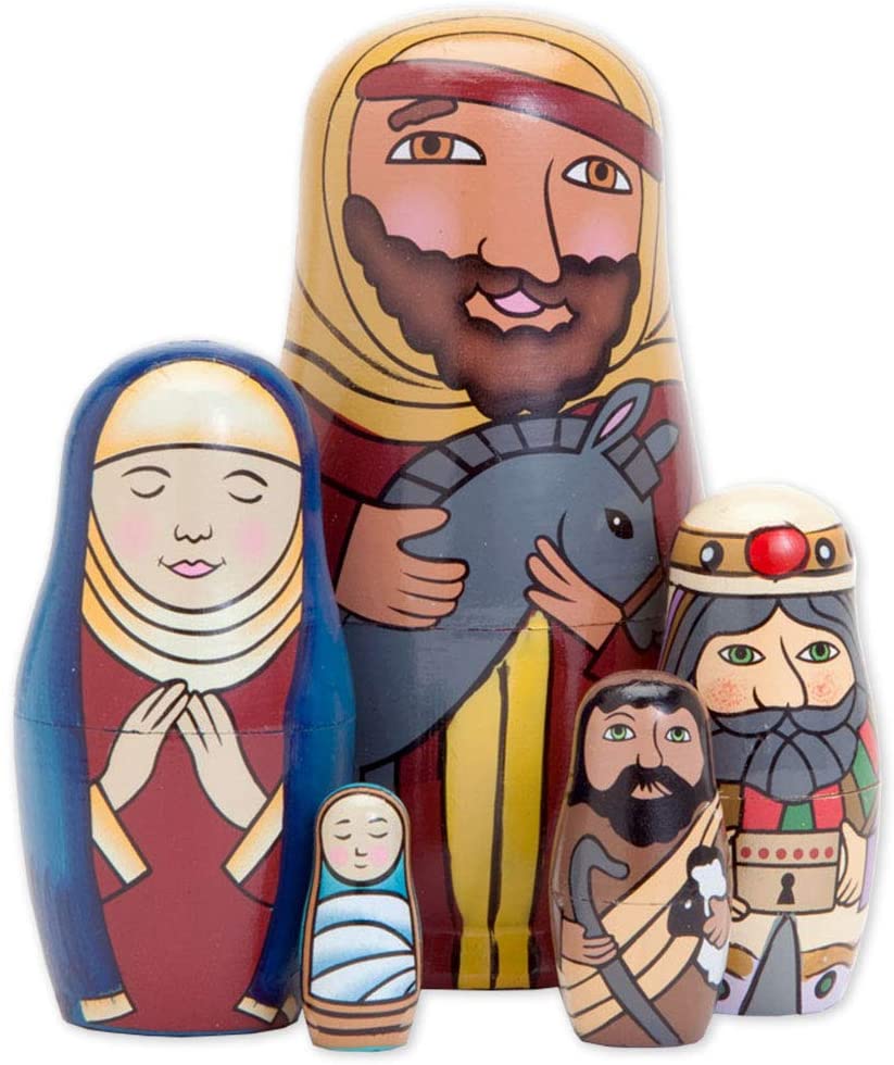 Bring joy to your holidays year after year with our hand-painted Holy Family nesting dolls This inspirational set features Joseph with his donkey, Mary, a wise man bearing gifts, a shepherd and the tiny baby Jesus High quality holiday nesting dolls A wonderful addition to any nesting doll collection or the perfect set to start one with Largest doll measures 5-1/2 tall