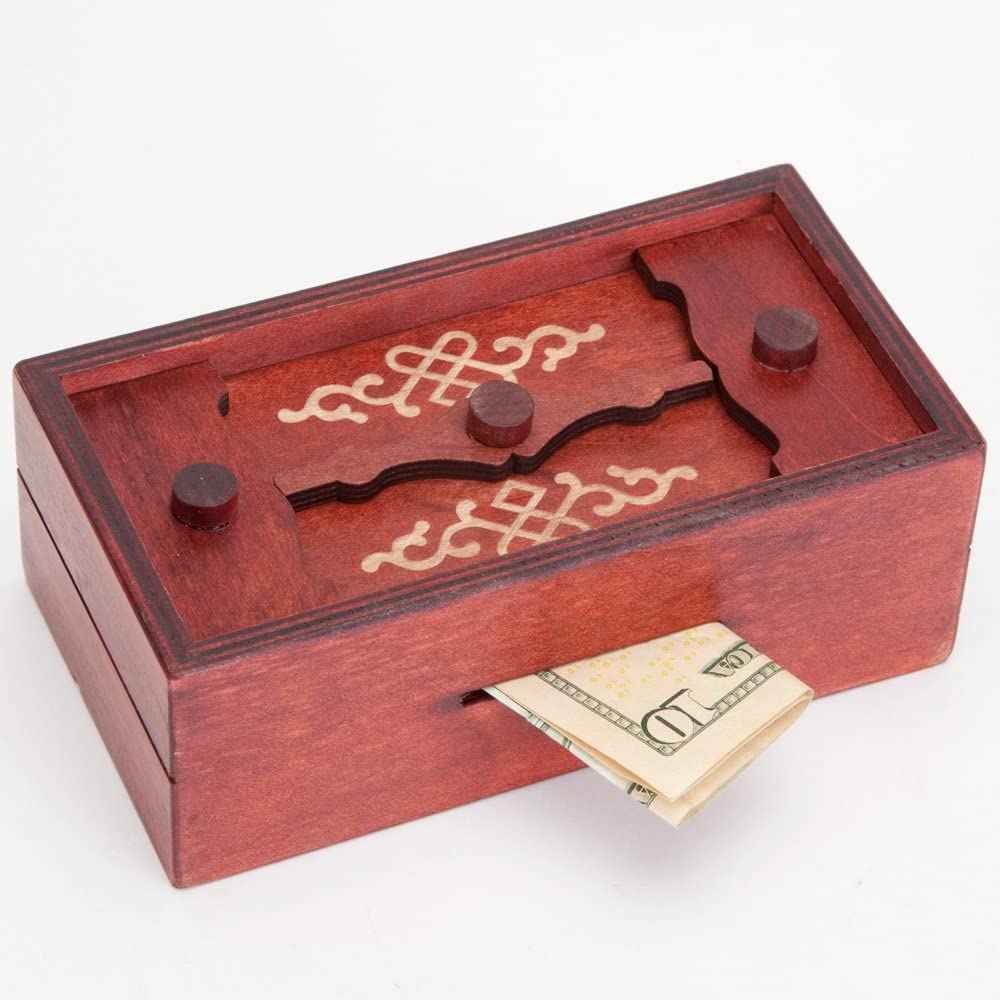 No one will be able to get to your savings using this clever box. Slide your coins and bills through the money slot then look for the challenging solution to open it. Made of pinewood with a rich walnut stain. Solution included. Measures 5 7/8” x 2 1/8” X 3 1/8”.