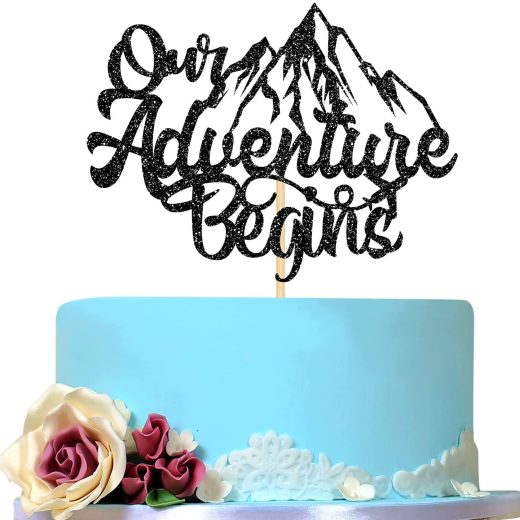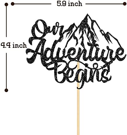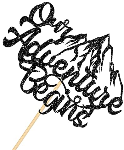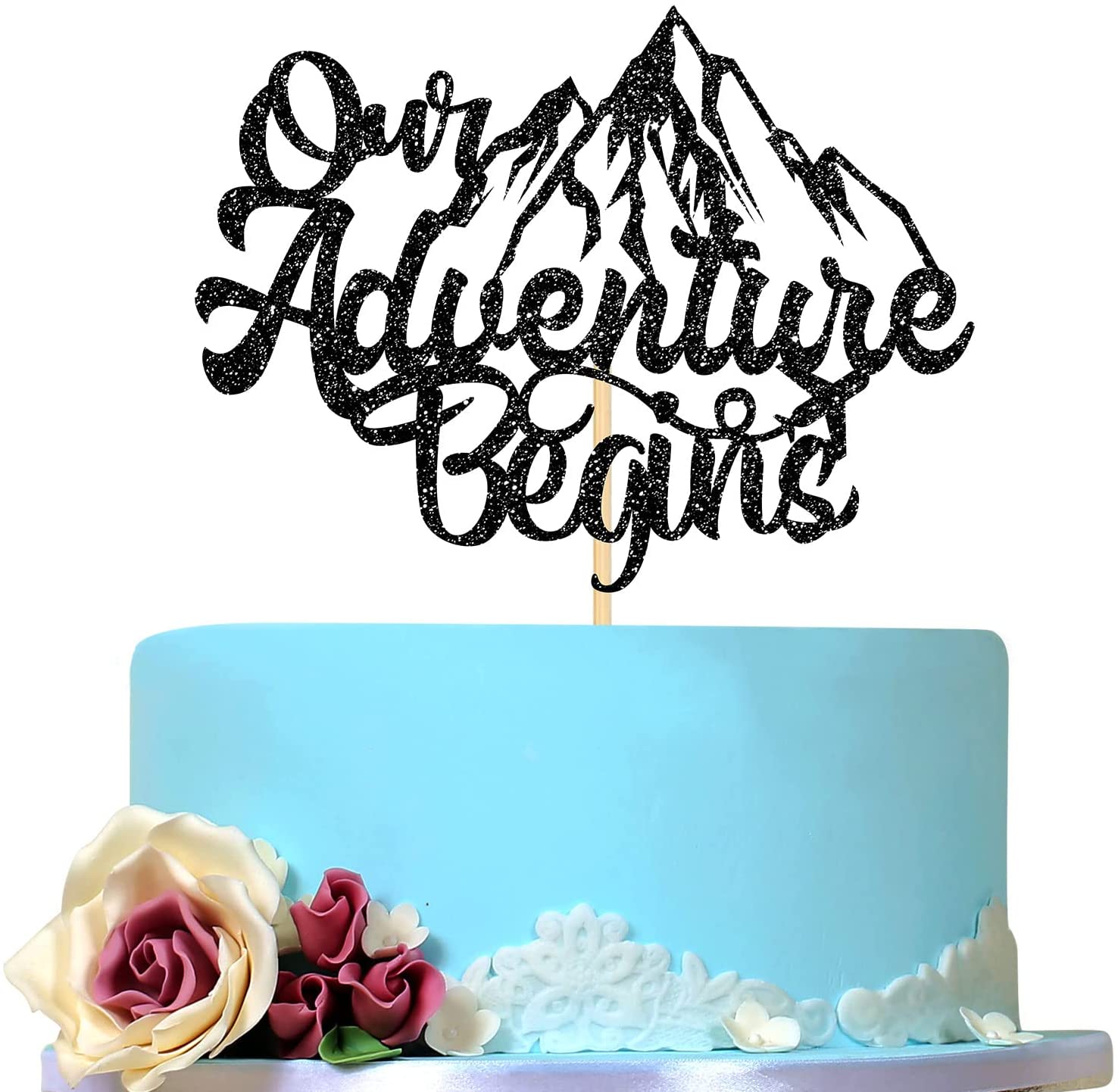 Black Glitter Our Adventure Begins Cake Topper, Baby Shower / Graduation / Wedding Cake Decoration, Rustic Going Away / Engagement / Retirement Party Sign, Celebration Wedding Party Supplies