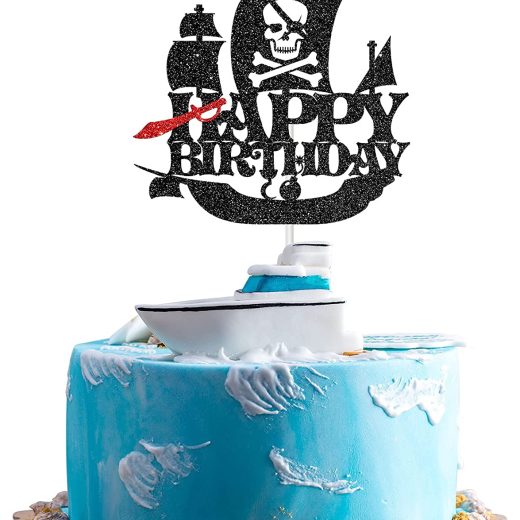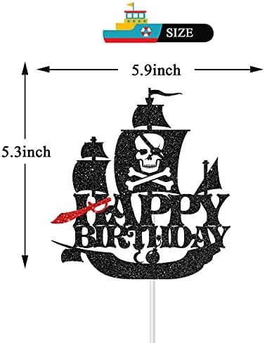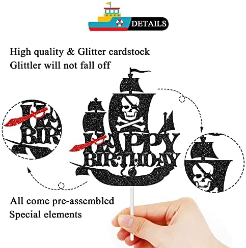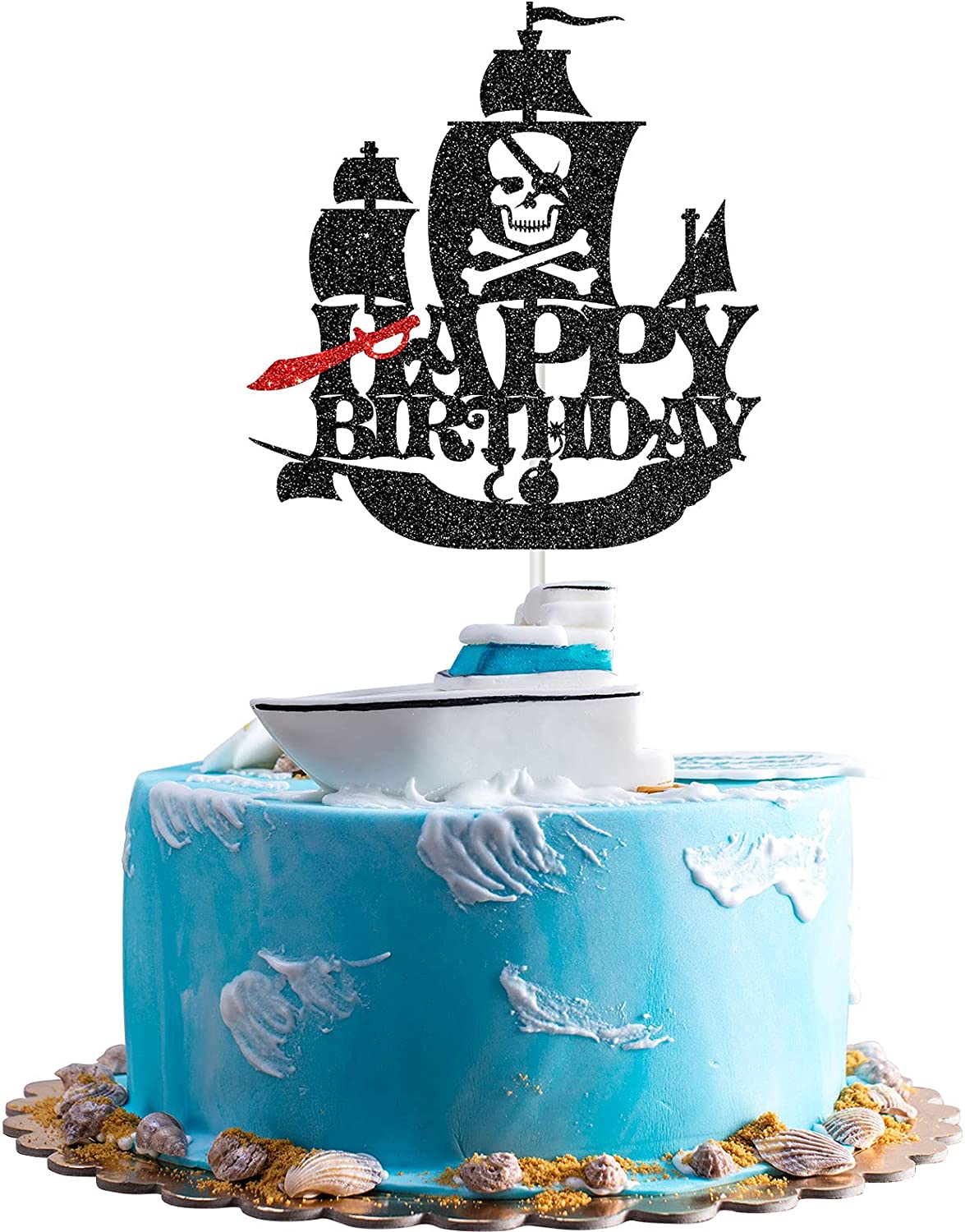 Black Glitter Pirate Themed Birthday Cake Topper, Pirate Themed Birthday Party Decorations for Kids Boys Men