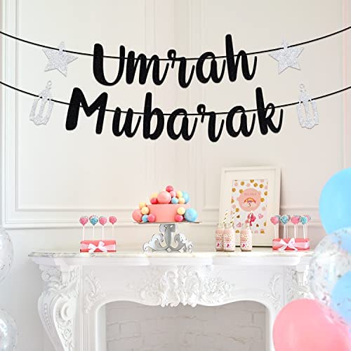 Black Glitter Umrah Mubarak Banner – Eid Mubarak Celebration Decorations for Muslim, Muslim Ramadan Party Supplies