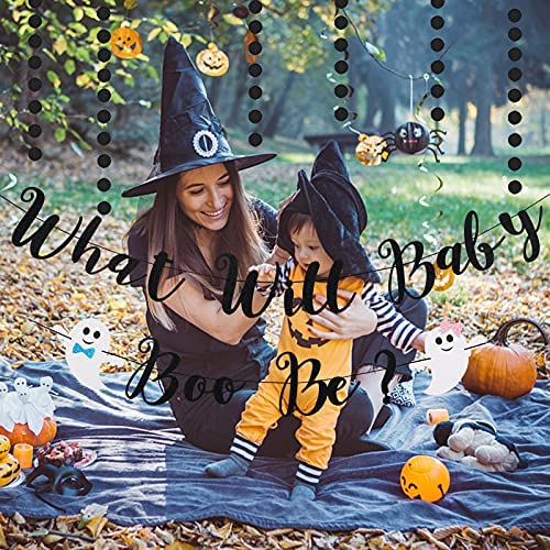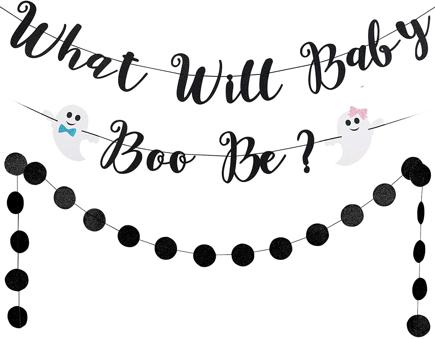 Black Glitter What Will Baby Boo Be Banner and Black Glitter Halloween Circle Dots Garland- Halloween Baby Shower Decorations,Boo Decorations,Ghost Decorations,Halloween Decorations for Home Fireplace Mantel Decor