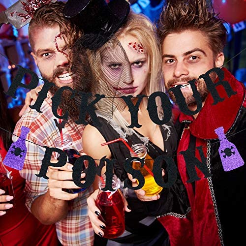 What you will get: 1Pcs Black Glittery Pick Your Poison Banner,Perfect for Halloween Party Decorations,High Quality Made. Party Decorations: Unique Design,Perfect for Halloween Party Decorations,Halloween Party Supplies,Fireplace Mantle Home Decor,Yard Decor,Haunted House Decorations. Banner Size: Use High Quality ECO-friendly Glitter Paper,Banner Each Card length approx is 6.7(17cm),Banner Need ASSEMBLY!! Very Easy!!! Perfect for hunging from branches and ceilings, or open against a wall, hanging up dessert tables, backdrops, and the overall party space,the adornment of the integral collocation of color is also very perfect place you want to decorate. Design: High Quality Material,Meet your quality needs,Our product design will highlight your gathering,And your satisfaction is our pleasure.