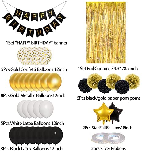 Black Gold Birthday Decorations for Men Women,Black Gold White Foil Confetti Latex Balloons Happy Birthday Banner Pom Poms Metallic Fringe Curtains for 18th 30th 40th 50th 60th Birthday Party Supplies