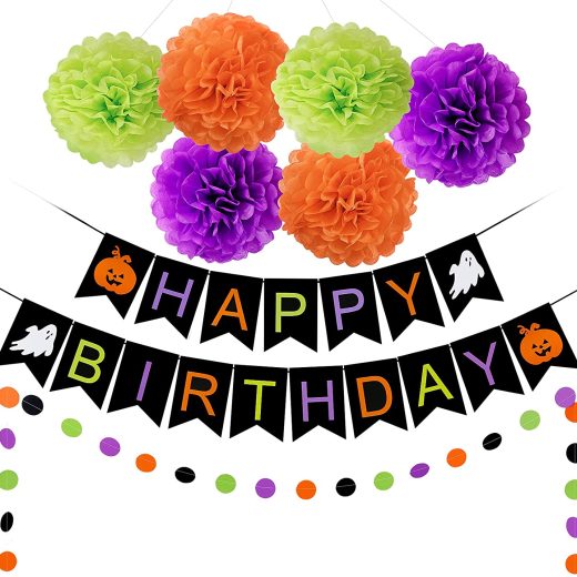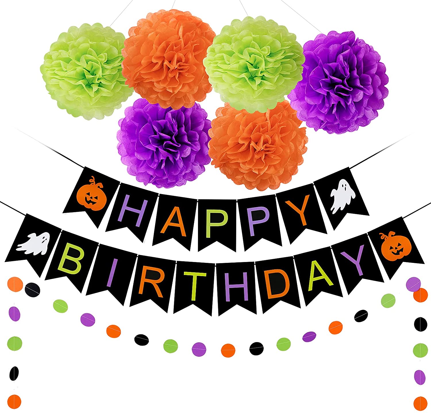 What you will get: 1Pcs Black Halloween Happy Birthday Banner,1pcs halloween circle dots garland, 6pcs Orange & Purple & Green tissue paper pom pom…