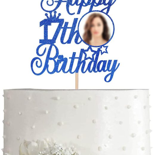 Blue 17 Photo Birthday Cake Topper, Glitter Kid Girl Boy Happy 17th Birthday Decoration With Photo Frame, Party Photo Props