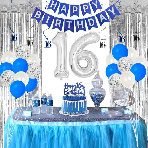 The set of birthday party decorations are blue and silver, your family and friends will be impressed by the birthday party supplies, it will bring you an unique party and make it a big hit.Package Includes: 1 blue happy birthday banner 1 set of silver 16 number foil balloon 40 inch 1 blue happy birthday cake topper 7*12 inch blue latex balloons 7*12 inch silver latex balloons 5*12 inch silver confetti balloons 6 hanging swirls 1 silver tinsel curtain