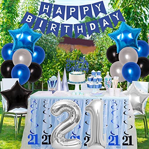 Blue and Silver 21st Birthday Decorations for Boy Men and Women 21st Birthday Party Supplies Pack 21 and Happy Birthday Balloons Banner Hanging Swirls Cake Topper