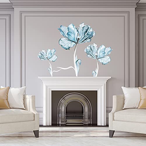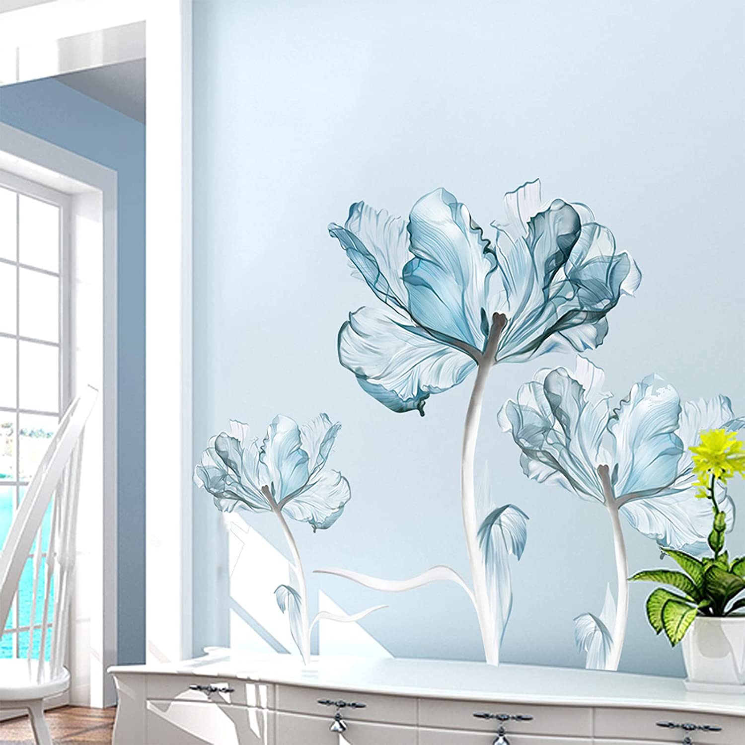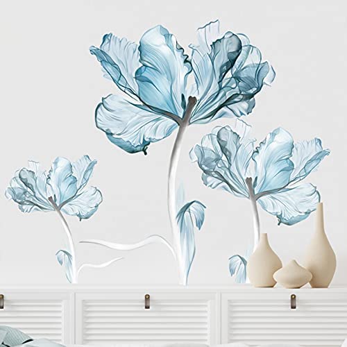 Blue Dream Flower Wall Stickers, ULENDIS DIY Removable Large White Light Blue Floral Lotus Wall Decals, Peel and Stick Mural Art for Nursery Living Room Bedroom Backdrop Wallpaper Home Decor