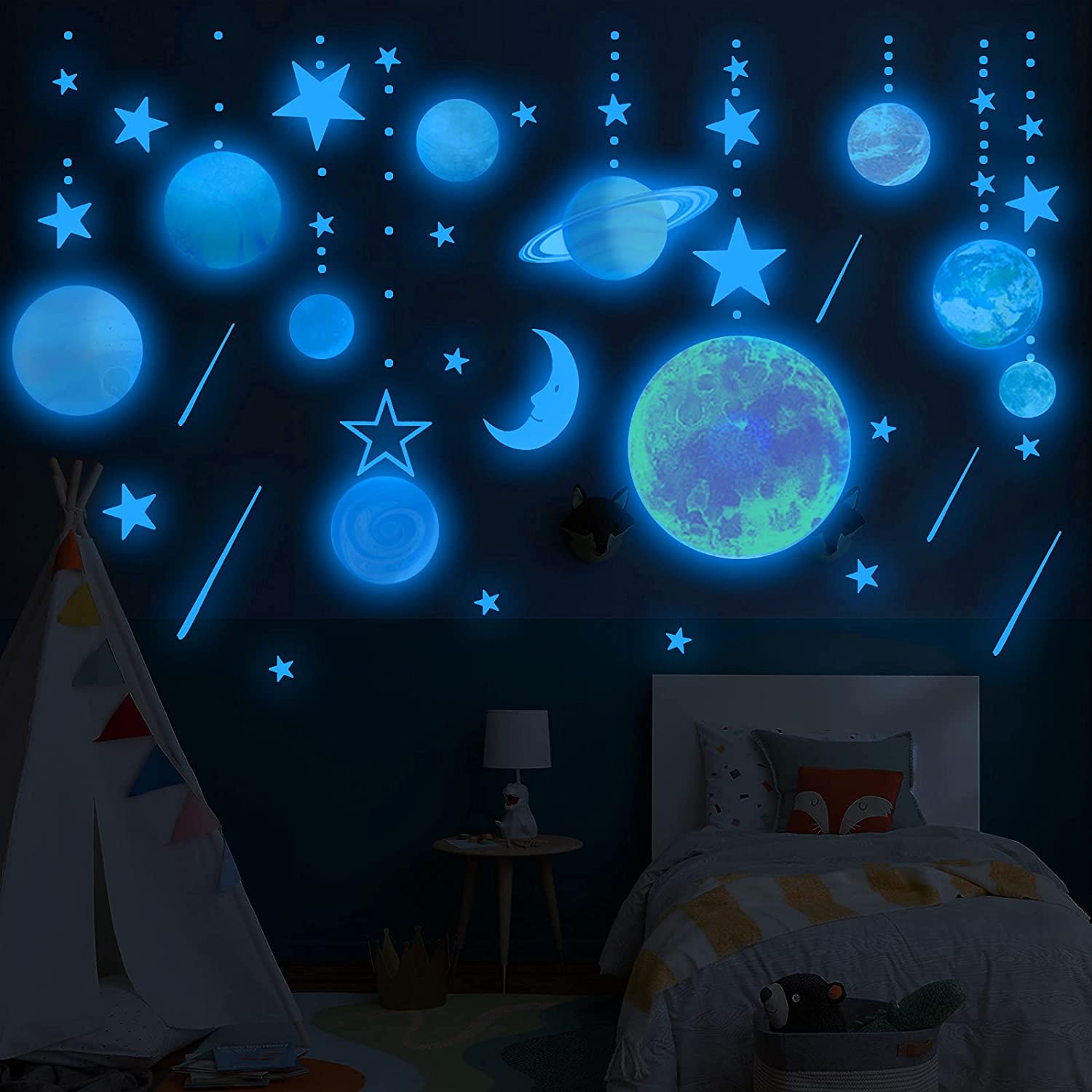 Blue Glow in The Dark Solar System Wall Decals,158 pcs Ceiling Light Stars and Moon Decorations, Planet Decor for Kids Bedroom, Outer Space Starry Sky Stickers for Girls Boys