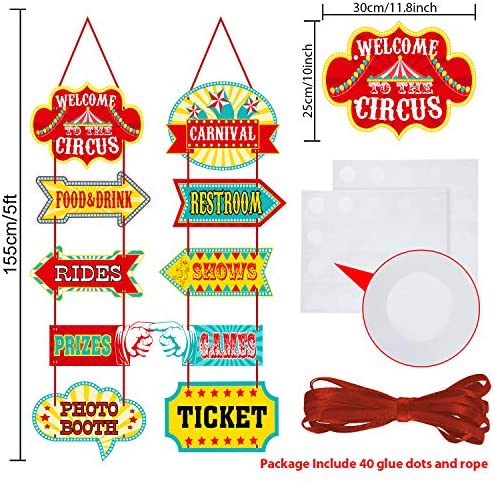 Packing includes : 10 pack circus sign cutouts, the size of each cards is 11.81 x 9.84 inch, 2 ropes which the length is 4 meters, 40 pieces non-trace glue point Easy assembly : the carnival theme party supplies are easy assembled with adjustable long ribbons, the cards can be move to your desired interval space, perfect for your every birthday, celebration or other event Reliable material : the circus carnival cutouts are made of thick cards with vibrant printing; Its seamless, durable, lightweight and non-fading. Wide application : the circus sign cutouts are suitable for all circus theme party with the vibrant color and chic design, can be hung to use like circus banner, stick it to the wall as a photo booth, take it in hand as photo booth props, great decorations for reunion party to welcome your family members or friends Great idea : circus accompany every kids childhood, it make us laugh and bring so much happiness to us; With this circus sign cutouts, you can decorate kids circus-theme rooms or classroom; Use as centerpiece for carnival theme party, as a photo backdrop for taking photos with your friends and have fun memories for the big day