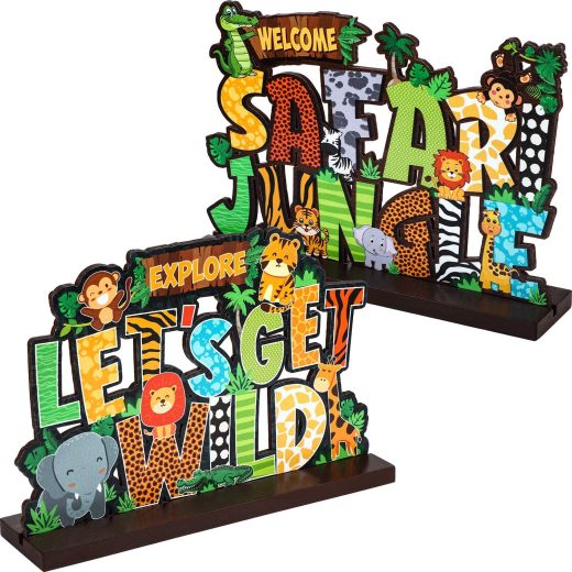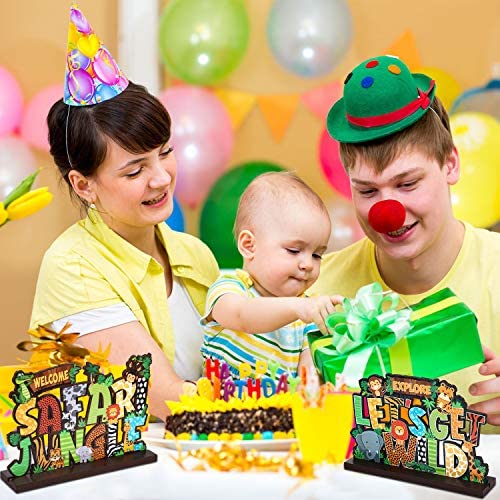 2 Safari jungle letter sign table decoration, wild animals table topper wooden plaque carnival table centerpiece for safari jungle baby one dinner coffee table topper jungle animals day gift house jungle animals wedding birthdays, 7.87 x 4.72 inch Safari jungle blocks wooden gift table top decoration safari jungle accent wild animals sign words safari jungles day decor Exquisite safari jungle table decorations: These zoo animals table centerpieces have 2 different cute Safari Jungle wooden decorations to create a wild animal atmosphere for your family in safari jungle holiday. Put them on your table, shelf or mantel. Easy to decorate: Fill any space with Wild Animals and happy felt sentiment. These safari jungle party decorations are easy stand with wood base. Attractive with any farmhouse, modern, or vintage decor. Safari jungle decoration and gift: These wooden Wild Animals table decor spell out your Wild Animals spirit in lettering funny quotes. Wild Animals Jungle Animals Day decoration/ Jungle Animals carnival, happy Thanksgiving Day, Christmas and great safari jungle gift. Size: Lets get wild jungle (explore): 20 x 13 cm/ 7.87 x 5.1 inch Safari jungle animals (welcome): 20 x 13 cm/ 7.87 x 5.1 inch Package includes: 1 x Lets Safari Jungle table topper 1 x Wild Animals table topper Note: Please make sure the size before you buying.