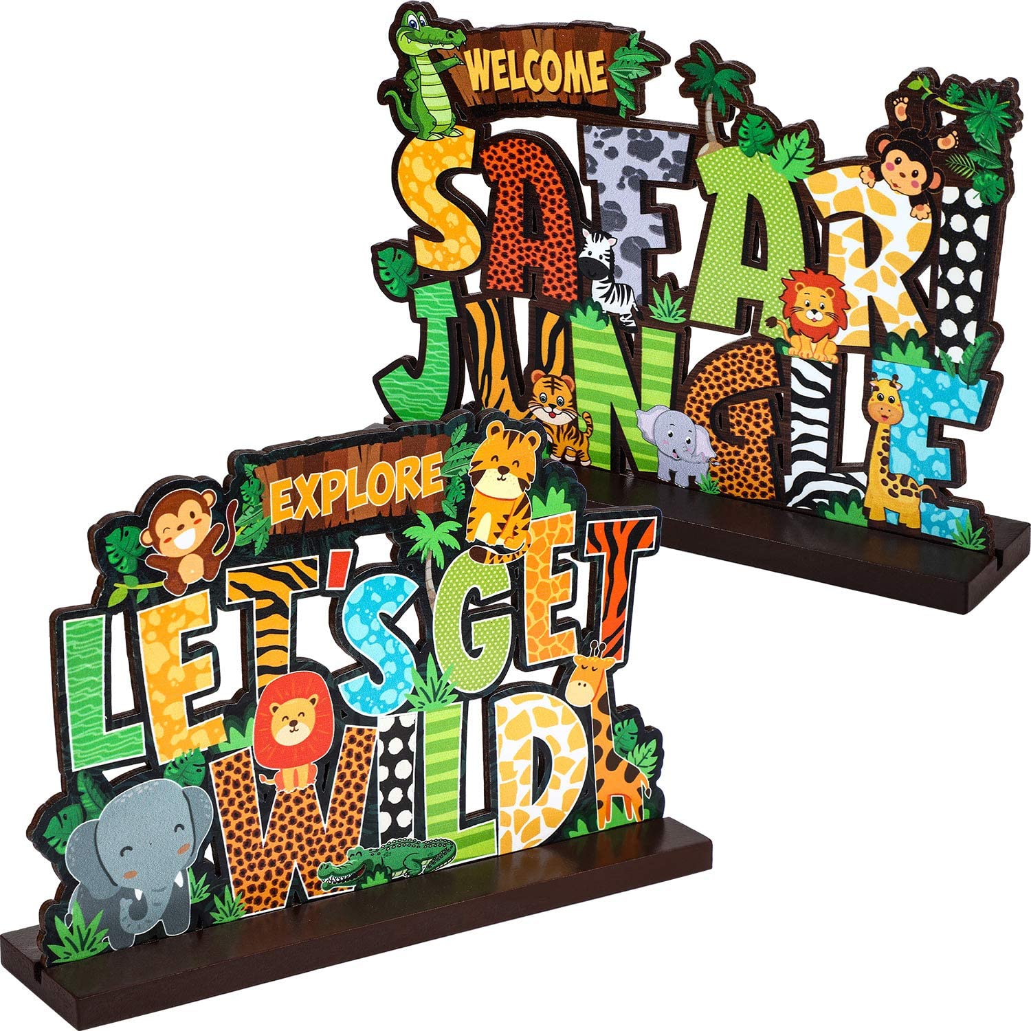 2 Safari jungle letter sign table decoration, wild animals table topper wooden plaque carnival table centerpiece for safari jungle baby one dinner …