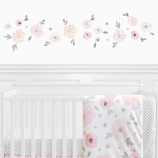 Blush Pink, Grey and White Wall Decal Stickers for Watercolor Floral Collection by Sweet Jojo Designs – Set of 4 Sheets