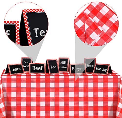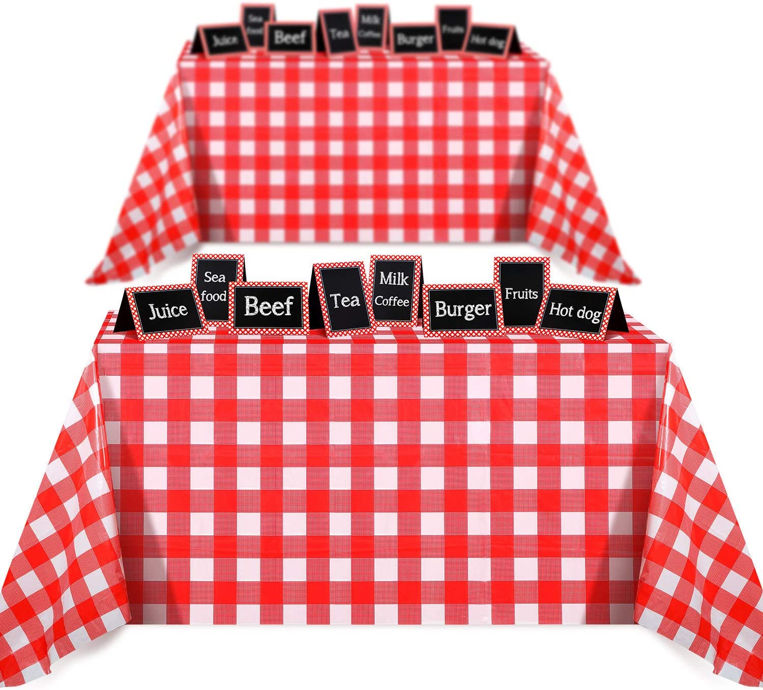 Boao 2 Pieces Red and White Gingham Checkered Table Covers Plastic Picnic Rectangle Tablecloth 51 x 72 Inch with 16 Chalkboard Tent Cards for Party Decoration