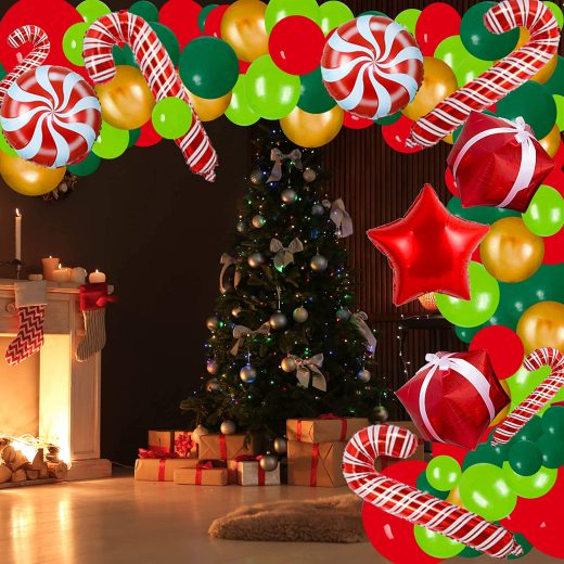 Packaging IncludesBalloon Package(3x18Red Balloon,30x10Red Balloon,5x5Red Balloon,30x10Dark Green Balloon,5x5Dark Green Balloon,12x12Chrome Gold Balloon,20×10 Light Green Balloon,5×5 Light Green Balloon)+(2×18 Candy Balloon[The edges are a bit blue],1×18 Star Balloon,2x24Gift Box Balloon,2×16 Cane Balloon,3×33 Cane Balloon)+(200pcs Dot Glue,1xBalloon Chain,1xRibbon,1xBalloon Knotter) High Quality MaterialsOur balloons are made of high quality latex materials, strong and durable, weight up to 3g. Suitable for a Variety of OccasionsBirthday themed balloons are perfect for parties, anniversary parties, childrens parties,company events, barbecues, photo shoots and any special events to make you an unforgettable party. Fast Easy AssemblyThe first step is to blow up balloons of different shapes and sizes. the second step, insert them into the plastic garland-making strip. the third step, hang the balloon garland according to your favorite shape. In just 30 minutes you will get a beautiful Christmas balloon garland party background. Have a Replacement BalloonOur balloons contain a large number of replacements that can be quickly replaced even if you accidentally blow the balloon.