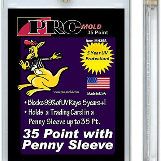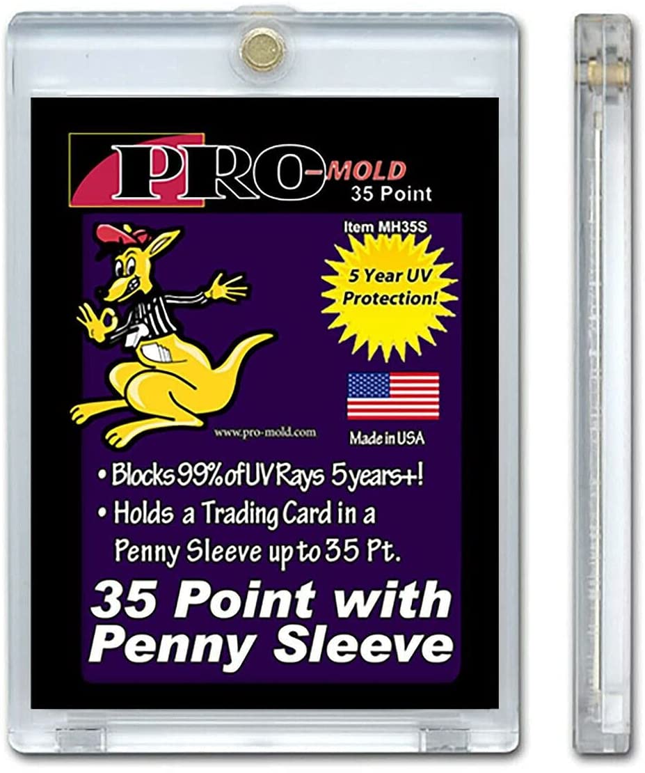 The hobbys first, non-graded, trading card holder that will hold a penny sleeve! Ideal for those cards that you are worried may scratch, like Pokemon Holographic, Panini Prizm, or Topps and Bowman Chrome cards. The Pro-Mold Magnetic Trading Card Holder features a gold magnet that provides a super-strong enclosure, which allows the holder to stay closed when dropped while its still easy enough to open up and put a trading card in it. This holder features a tab on the top of each side that allows you to use a quarter or set of fingernails to open the holder up easily. These holders also feature recessed, arrowhead corners to protect the cards corners if you drop them.