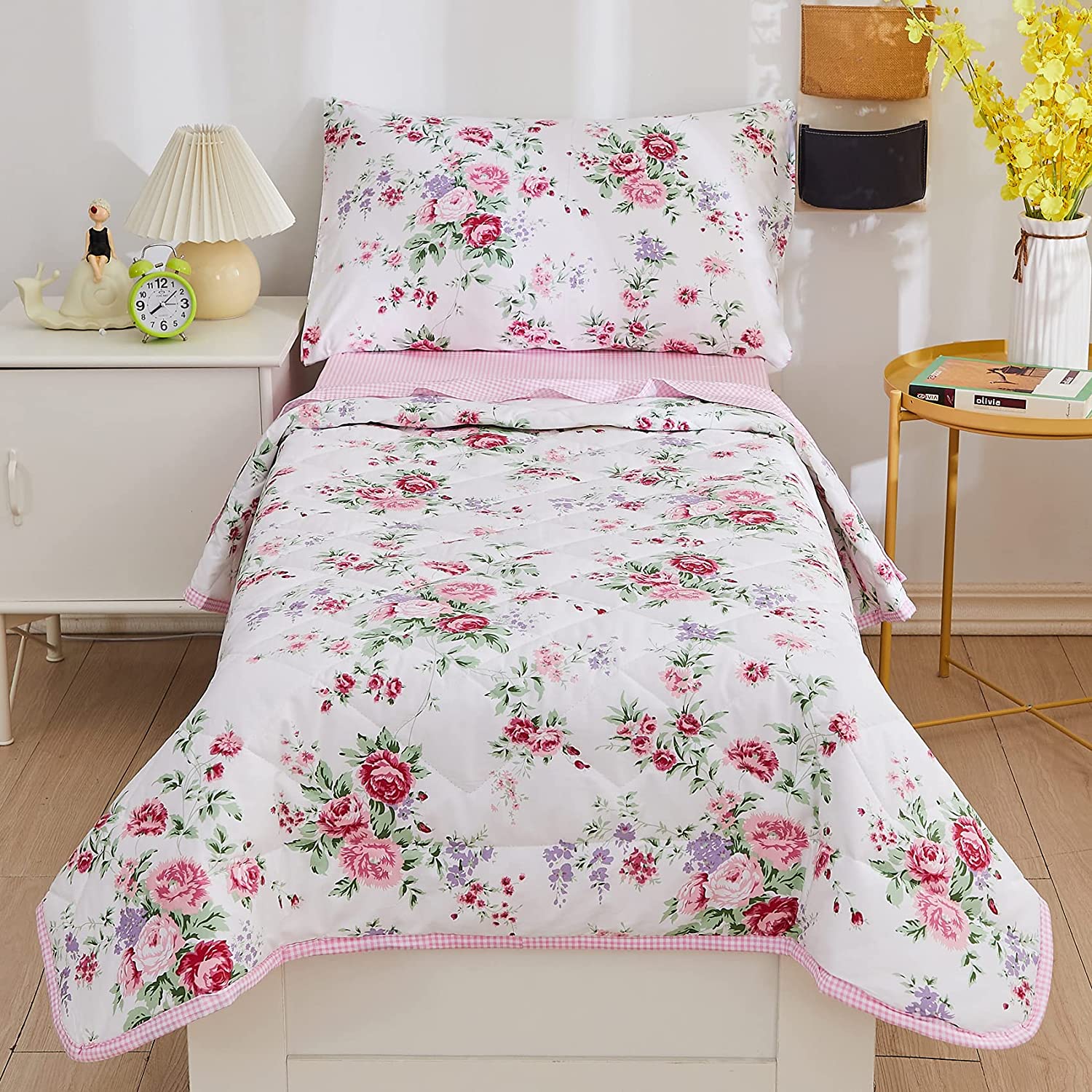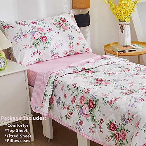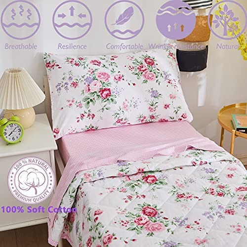 ream 4 Pieces Toddler Bedding Set With Garden Pink Floral Girls Toddler Bed Comforter Sheet Set And Pillowcases, Ultra Cozy Pure Cotton