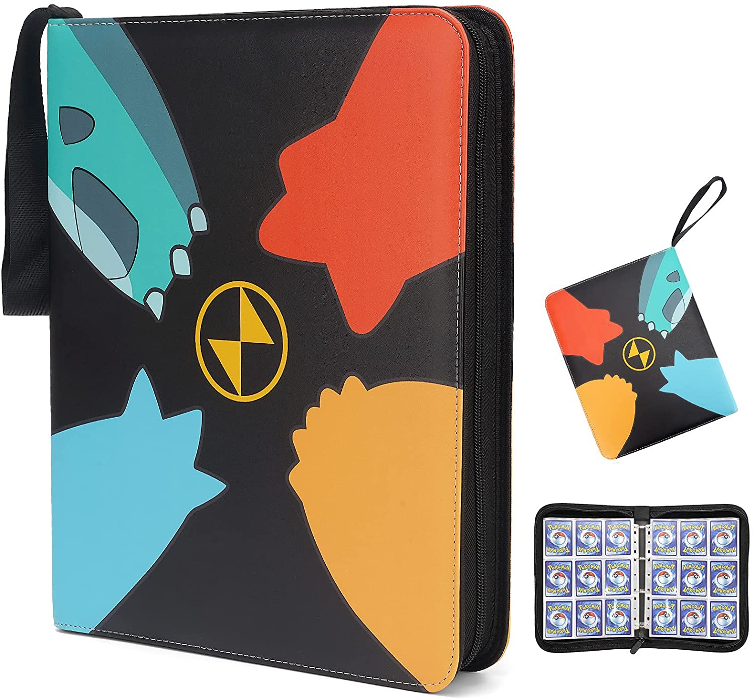 WIDE APPLICATION:Our 9-Pocket zippered trading card binder is not only perfect fit all kinds of game cards like MTG, Yu-Gi-Oh, , Star Wars X-Wing, but also compatible with standard sized cards such as Football cards, Baseball cards, Playing cards, Mini Polaroid photos Huge Capacity Cards Storage Space: This carrying binder case comes with 4-ring binder, 50 Premium 9-Pocket Pages. It means that it can holds up to 900 cards., providing plenty of space to get all your cards organized. High-Quality Materials:The outside of this card binder is made from Durable and Waterproof PU material, comfortable to touch, good to protect your card from fading and stain, besides, Soft cotton hand strap is convenient for you to carry them everywhere. Perfect In the Details:The quality zipper seals the binder to keep the cards intact while giving you the smooth feel, The middle layer is environmental protection material(EVA), which has good shock and moisture resistance and provides a series of protection. Special Gift:Unique design with novel style, Perfect as a Gift for boys and girls. Lively and cute cartoon image will catch your attention the moment they see it, and reminds you of the adorable creatures.