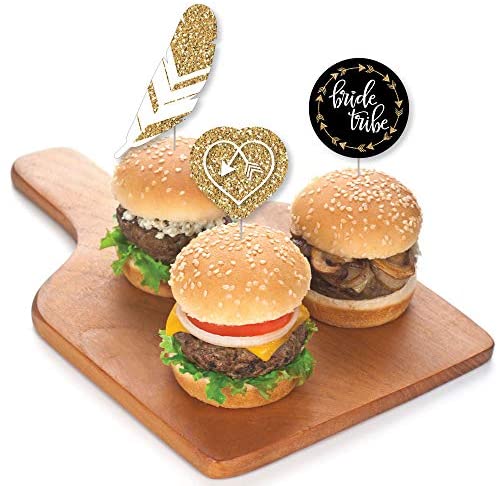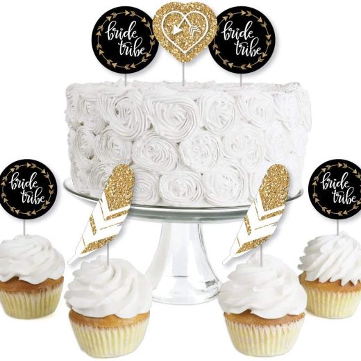 Bride Tribe Dessert Cupcake Toppers INCLUDES 24 clear treat picks, 24 shaped paper cut outs and stickers for easy assembly. DIY Bride Tribe cupcake supplies are perfect for a bridal shower or bachelorette party. Plastic clear treat pick SIZE 3.5 inches tall with the completed height of the Bride Tribe Dessert Cupcake Topper depending on where the plastic pick is attached to the shaped paper cut out. Cupcake toppers are perfect for standard cupcakes and can also be added to appetizers and individual servings of other sweet treats such as brownies or donuts, and even used to create small fruit kabobs. EASY PARTY DECORATIONS: Bride Tribe bridal shower or bachelorette party picks make it easy to style a black and gold theme party. Create impressive cupcake towers with decorated treats placed on a tiered stand at the candy buffet table, style adorable tables with individual cupcakes at each place setting, or make creative centerpieces using decorated treats and a coordinating treat stand. PREMIUM PARTY SUPPLIES: Clear treat picks are made of food-grade plastic and packaged in a food-safe environment. The Bride Tribe paper cut out toppers are professionally printed on heavy-duty cardstock paper with themed art on one side and a coordinating pattern on the back. Cut outs will quickly attach to the clear dessert pick and then easily insert into your party appetizers or desserts. EASY ASSEMBLY INSTRUCTIONS INCLUDED: Clear treat picks and Bride Tribe shaped cutouts will ship with easy assembly instructions to create unique dessert cupcake toppers. Bride Tribe Dessert Cupcake Toppers use a No-Mess Glitter Print: Our cupcake toppers are designed with a printed image of glitter, eliminating glitter flake while maximizing bling effect!