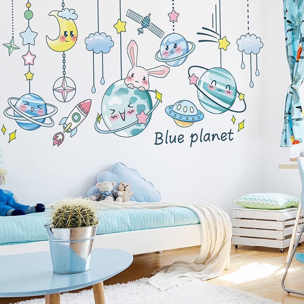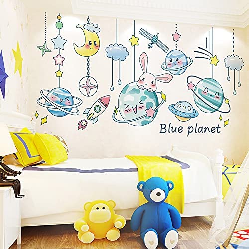 BuerHomie Blue Planet Wall Stickers, Star Nursery Décor for Living Room, Baby Moon Pictures for Bedroom, Clouds Wall Décor for Boys, Universal Wall Art, DIY