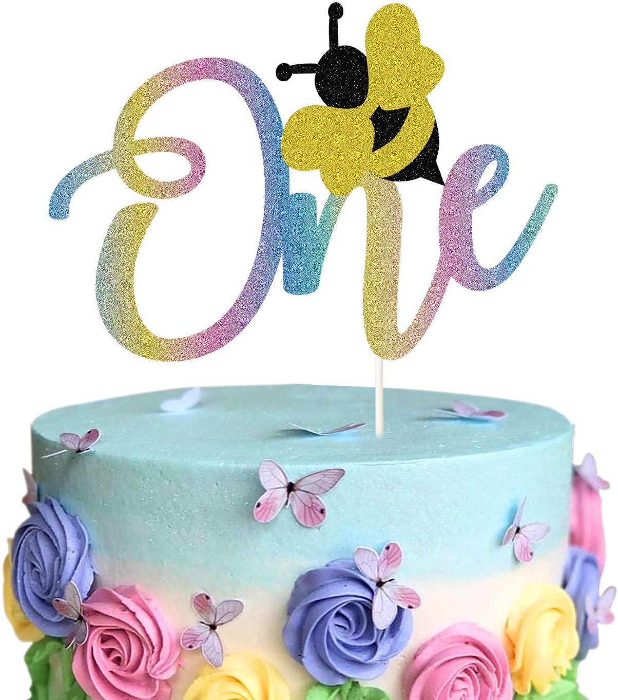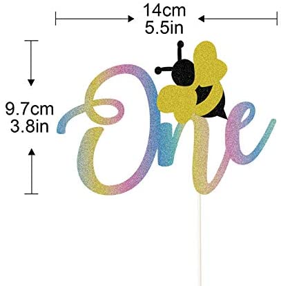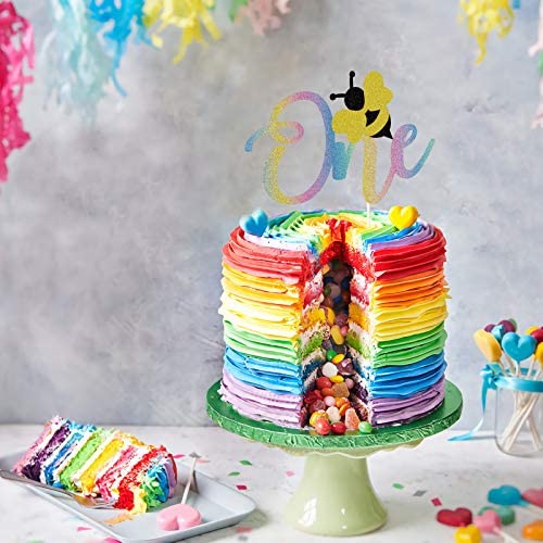 Bumble Bee One Cake Topper,Rainbow Glitter Bee Themed for Baby Boy Girl First 1st Birthday Party Decorations,Happy Birthday Baby Shower Anniversary Cake Decoer