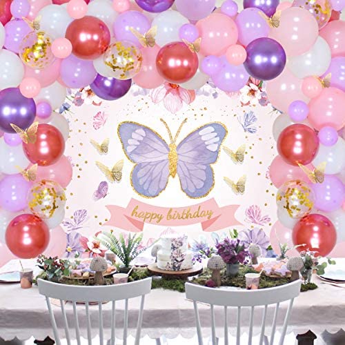 Butterfly Birthday Party Decorations for Girls – Butterfly Balloon Garland Arch Kit Happy Birthday Backdrop, Pink Purple Gold Confetti Balloons for Garden Floral Birthday Party Supplies