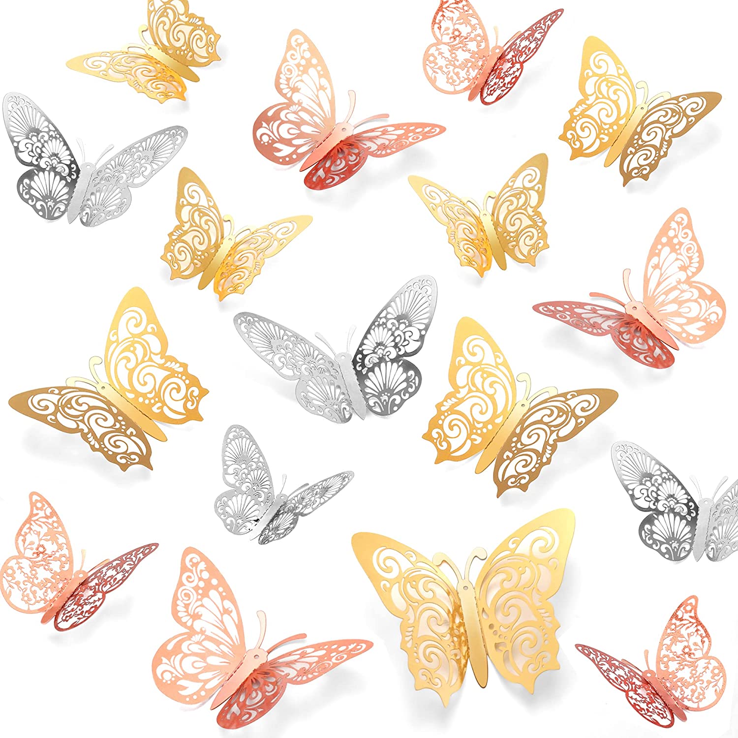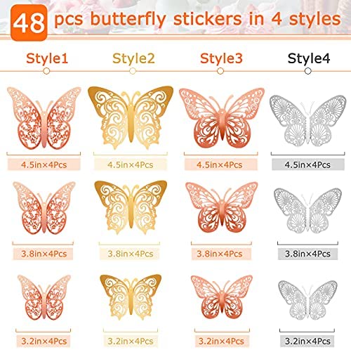 Butterfly Decorations Party 3D Butterfly Wall Decor Stickers, 48Pcs 4 Patterns 3 Sizes, Butterfly Cake Decorations Paper Butterflies for Kids Baby Birthday Bedroom Room (Rose Gold & Gold & Silver)