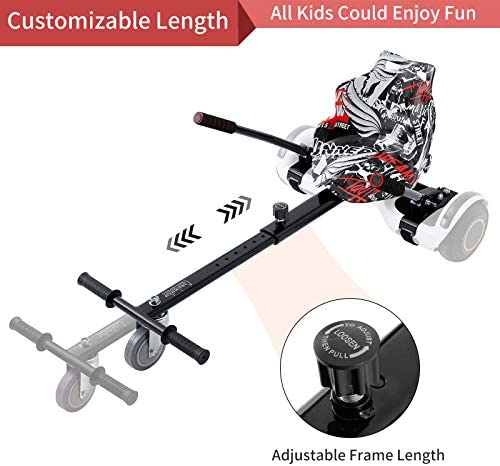 ADJUSTABLE HOVERBOARD ACCESSORIES length is 31-44 inches which Suit for kids or adults. The kart kit is solid. Max load 270lbs hoverboard go cart Can be used in parks, streets, indoors, etc. Can be given to children as a gift