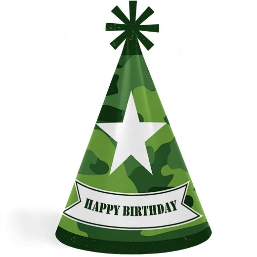Camo Hero – Cone Happy Birthday Party Hats for Kids and Adults – Set of 8 (Standard Size)