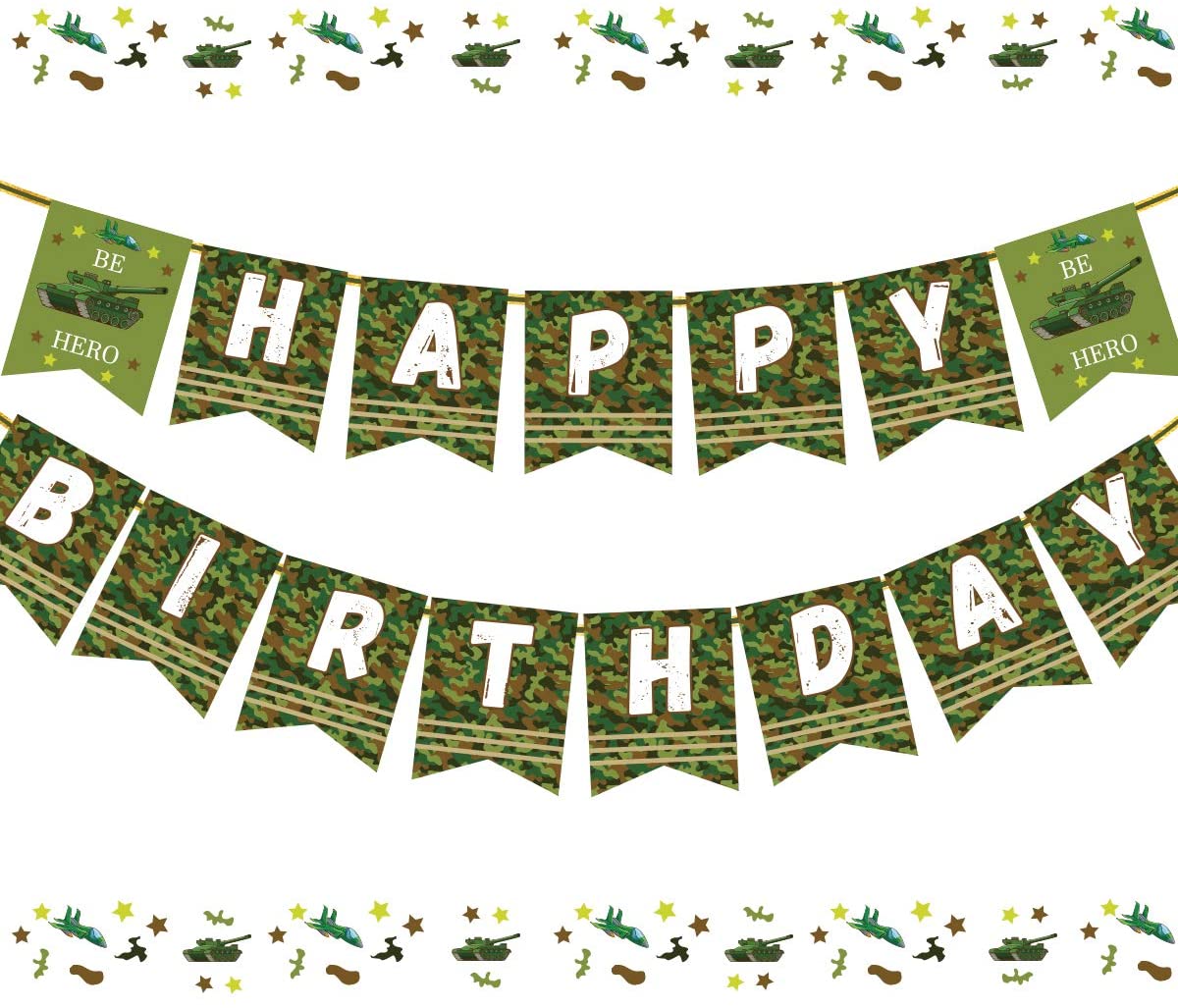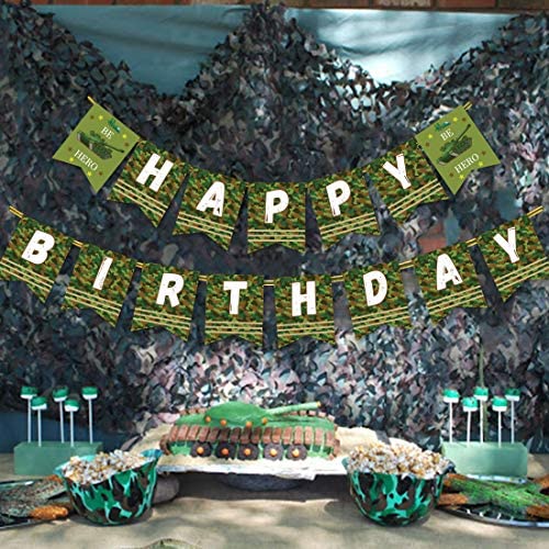Custom Be Hero Banner: The package include 1 happy birthday banner, it has been pre-strung by us that could help you save time to decorate your party. Size: Each piece of the banner is 6.3*7.8 inches and there are total 15 pieces. Premium Quality: The banner made of high quality cardstock with clear army tank pattern, that could be reused or keep to decorate the room after party. Multiple Usage Occasions: It could be used for military themed party, army themed party, camo hero themed party, tank themed party, soldier themed party, bring a joyful and happy birthday party to you. Rest Assured to Buy: A friendly customer service stands behind our items, please contact our customer service team if you are not completely satisfied with our decorations.