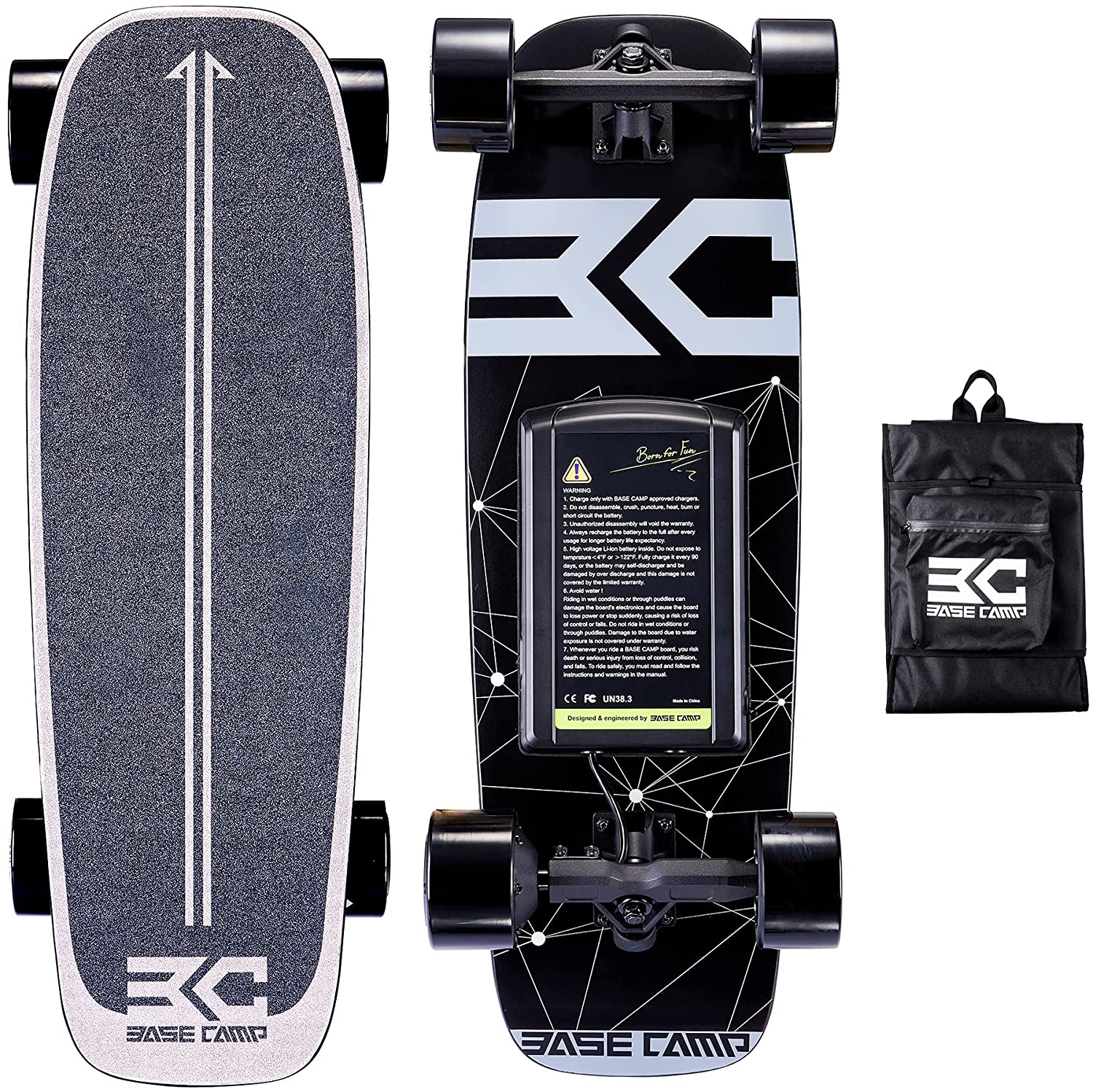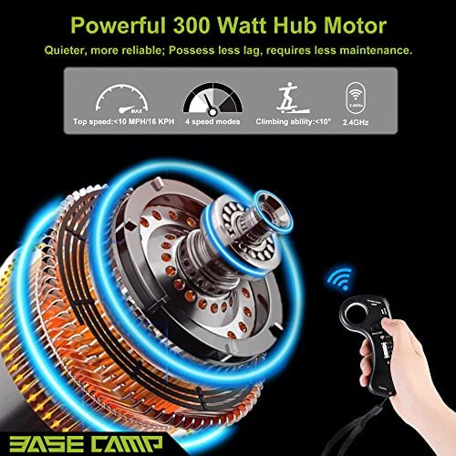 Powerful & Low Maintenance Hub Motor – BASE CAMP electric skateboard equipped with 300W hub motor making this intelligent electric skateboard quieter and more reliable, and possessing less lag, requiring less maintenance, supporting 10MPH top speed, 10-degree climbing hills, riding in the grass or inside the city