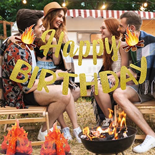 Camping Theme Happy Birthday Banner One Happy Camper Birthday Decorations Camping Birthday Party Supplies (With two 3D Decorative Cardboard Campfire Centerpiece)