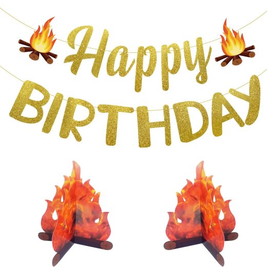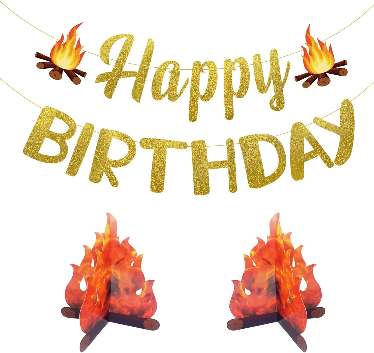 Camping Decorations Package Include:1 set HAPPY CAMPERS banner and two 3D Decorative cardboard campfire centerpiece. Happy campers DecorationsThe Happy campers decorations is perfect for birthday party, camping themed party, baby shower, family gathering, wedding, dancing party, outdoor party and more! Super Reliable Material :The camping decorations, inlcude camping bannerscamping cake topper and 3D Decorative Cardboard Campfire Centerpiece are made of high-quality glittery cardstock, shiny and no powder fallen. Easy to assembleThere is a gap between the two cards to insert together for fixing it as a fake flame; Its easy to install anywhere, saving your time to decorate. 100% GUARANTEE:If you are not satisfied with the camping decorations, you can get a 100% refund unconditionally. Buy with Confidence! Our halloween mantel decorations are backed with a 61-day,no-hasste money-back guarantee. please contact us in case of any problems, we will do all we can to make you satisfied.