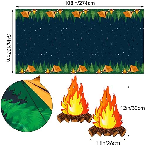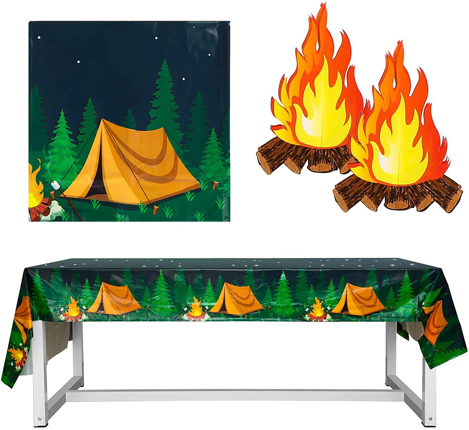 Camping Theme Tablecloth Set, Including 2 Pieces Hiking Camping Rectangle Tablecloth and 2 Pieces Fake Campfire 3D Decorative Cardboard Centerpiece Decor for Birthday, Baby Shower, Theme Party