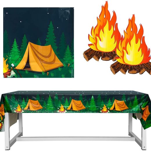 Camping Theme Tablecloth Set, Including 2 Pieces Hiking Camping Rectangle Tablecloth and 2 Pieces Fake Campfire 3D Decorative Cardboard Centerpiece…