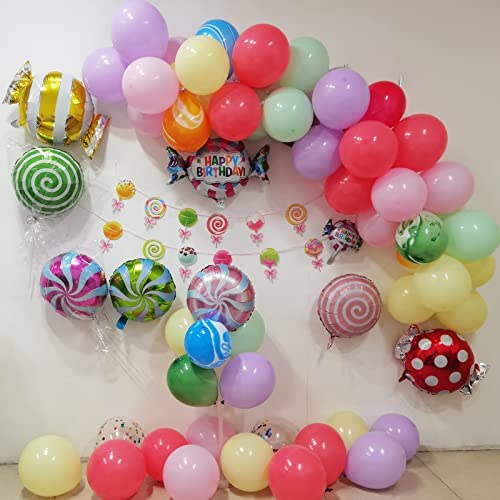 SWEET CANDY DESIGN:These cute rainbow candy banner,sweet lollipop balloons,candy cupcake toppers will take kids enter into a candy land.Let your kids enjoy their sweet candy birthday party! MULTICOLORED BALLOONS AND RICH TYPES:Our candyland party decorations set use multicolored balloons and rich types.Contains candyland banner,sweet candy mylar balloons,cake topper,agate balloons,confetti balloons.They are a perfect match for the candy theme party. PERFECT PARTY IDEAS:Perfect for candyland birthday party,wedding,home party,sweet candy shop party,baby show,donut party,candy game.Let the candy accessories bring the fun and sweetness to your party! PACKAGE:This candyland theme party decorations set contains 64 accessions.1pcs rainbow candy banner,11pcs candy shaped balloons,10pcs marble balloons.20pcs pastel balloons,2pcs multicolored confetti balloons,17 candy cupcake toppers,1 set Happy Birthday cake toppers,2 roll of ribbons. PLEASE DO NOT blow up the latex balloons with mouth,as there may be dusts on the surface.