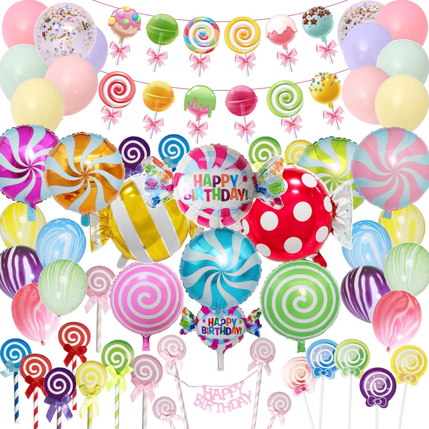 Candyland Party Supplies Set – 64pcs,Candy Party Decorations with Lollipop Banner,Sweet Candy Balloons,Candy Cake Toppers,Latex Balloons for Girls,kids,Candyland Party,Lollipop Party,Birthday