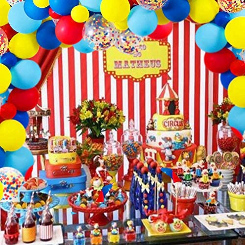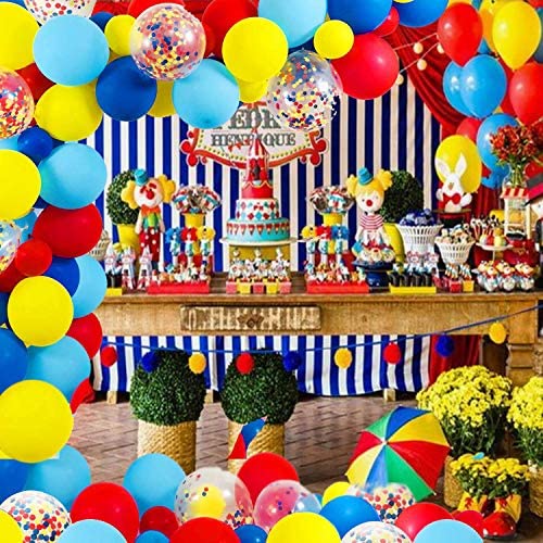 Carnival Circus Balloon Arch and Garland Kit, 105 Pack Red Blue Yellow Latex Balloons and Rainbow Multicolor Pre-Filled Confetti Balloon for Carnival Baby Shower Wedding Birthday Graduation Anniversary Bachelorette Party Background Decorations