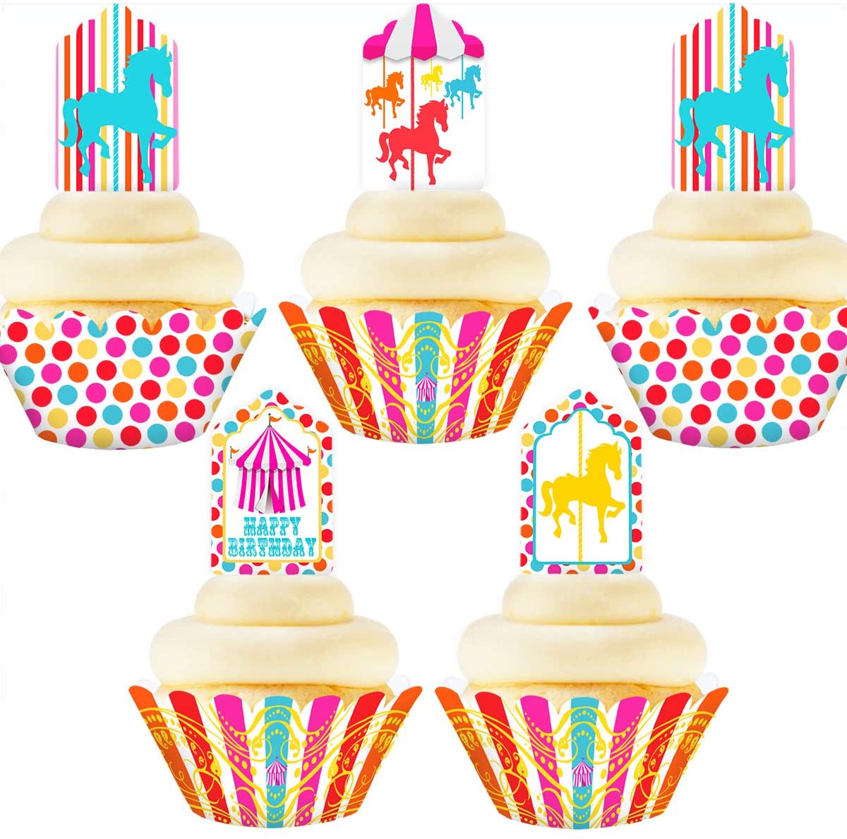Carousel Circus Cupcake Toppers and Wrappers – 24 Cupcake Toppers and 24 Cupcake Wrappers – Carousel Party Supplies – Carousel Party Decorations – Circus Party Supplies – Circus Party Supplies – Multi Cupcake