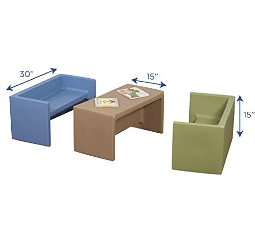 3 IN 1 KIDS BENCH OR TABLE: The Adapta-Bench was created to take our Cube Chairs fun element to the extreme. This bench offers you three options for the price of one. Use on one side for smaller toddlers, then turn the chair upside down as your kids grow for a higher seat. (6 and 9 high seats.) The third option is to turn the Adapta-Bench on its side for use as an activity table. Corners are gently rounded for safety. PERFECT FOR IN HOME LEARNING: Its extremely common for parents to be homeschooling their kids while daycares and schools are closed. Setting up a kid-sized activity table or desk with some child-sized seating will help normalize the lives of your children so you can attempt to keep their school learning on track while you also get some work completed. INDOOR OR OUTDOOR USE: Constructed from durable yet lightweight LLPDE material, Adapta-Benches are easy to move from indoors to outdoors. Why not set up a tea party in your back yard this summer In the winter, move the fun back indoors. Wipe clean with soap and water. PRIMARY OR WOODLAND COLORS: The Adapta-Bench comes in fun, bright colors to add excitement to any playroom décor. Conversely, if you prefer the calming colors of Mother Earth, then the Adapta-Bench also comes in our Welcoming Woodland palette. Purchase benches individually or in sets to create cute reading nooks or spaces for kids to socialize. 1 almond, 1 fern, and 1 sky blue Adapta-Bench included. Other colors sold separately. DIMENSIONS: 30 x 15 x 15 in. AGES: 12 months and up. NO ASSEMBLY REQUIRED. WARRANTY: 5 years.