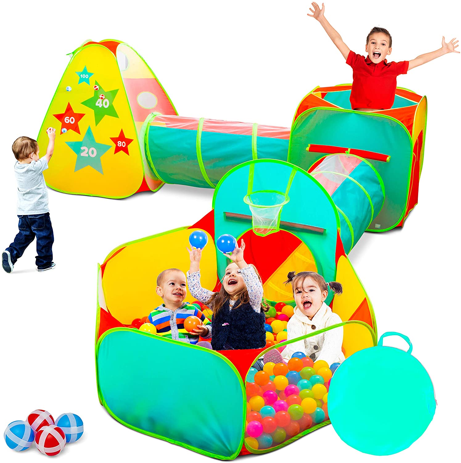 Childrenu2019s 5pc Pop Up Play Tent with Ball Pit & Crawl Tunnel u2013 Pretend Playhouse for Kids, Toddlers, Boys, Girls, Indoors & Outdoors u2013 Target Game with 4 Dart Balls u2013 with Carry Case