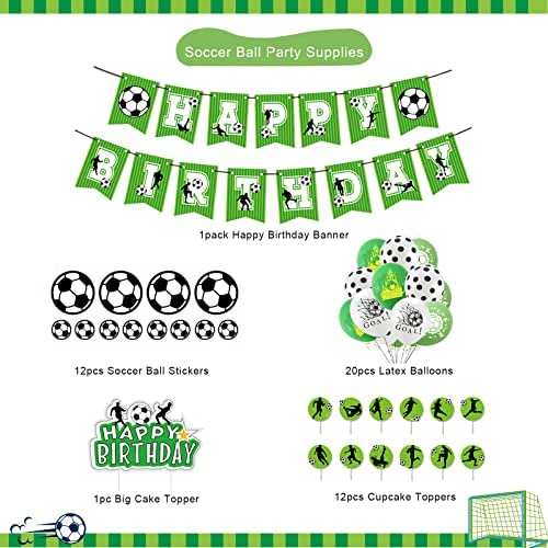 [Ideal Soccer Party Decors] – The birthday decorations kit combined with multiple soccer elements designs, high-quality printed makes these decors more novel and attractive. Perfect decors for sports fans, who are obsessed with soccer, a wonderful addition to your soccer party! [Soccer Decorations Kit] – Come with 1pack of Happy Birthday banner, 1pack of soccer ball stickers(12pcs, 2 sizes), 1pc big cake topper, 12pcs cupcake toppers, 20pcs soccer theme latex balloons (4 styles). [High-quality & Valuable] – Made from eco-friendly paper and durable material, sturdy and reusable. Enjoy creating an active celebration party scene for kids soccer/football theme birthday by using the bday banner, soccer ball stickers, and balloons set. Thatll make your party unique and fancy. [Widely Uses] – Suitable for all ages, especially for soccer/football/futbol fans. Great decors for world soccer sports theme parties, birthday celebrations, teens room decor, wall/window decor, outdoor scenes, etc. Bright colors, novel designs will impress guests, both kids and adults will love the soccer decors. [Satisfied Services] – Your satisfaction is our priority. If theres any issue with the item you received, pls e-mail us, well free-hassle for you to resolve with a replacement or arrange a refund. Wish you enjoy the party!