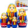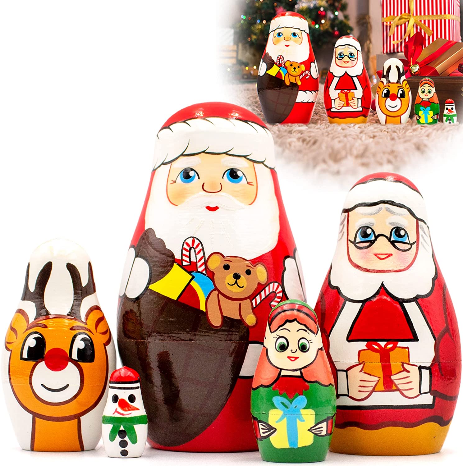 EXCELLENT DESIGN: matryoshka in a form of Mr and Mrs Claus, Deer, Elf, Snowman for christmas decor ONLY ECO-FRIENDLY MATERIALS: natural wood, hand painted water-based paints, finished with varnish UNIQUE GIFT FOR EVERYONE: russian doll is great home decoration and educational toy for kids PERFECT DIMENSIONS: largest doll is 3.5, smallest is 0.8. Set of matryoshka dolls includes 5 pcs AEVVV is proud of high-quality russian matrioskas, if you arent satisfied well refund the purchase