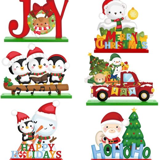 What You Get – Includes 6 Christmas table decorations. 6 different Christmas image designs. Santa Claus 6.5 x 7.4 inches. Christmas tree and truck 6 x 8 inches. JOY Rudolph and Christmas wreath 5 x 7.4 inches. Happy Holiday Snowman 6.3 x 7.4 inches. Merry Christmas Bear 6.2 x 6.3 inches. Three penguins 6.3 x 8 inches. Christmas Wooden Table Decorations Centerpiece Signs – These Christmas theme appearance wooden decorations for table include abundant Christmas elements, such as Santa and truck, JOY Rudolph and Christmas wreath, Happy Holiday Snowman and Merry Christmas Bear. Its suitable for Christmas and happy holidays. Countless Uses – Cute centerpiece signs that add a perfect touch to your decorations. Exactly what you need to put the final touches on your Christmas decor. Your party guests will shine when they see the Christmas table decor. Bright colors will be more vibrant, pleasant and create happy Christmas atmosphere. In addition to as a decoration, it can also be used as a Christmas gift for children and friends. Our Advantages – Elegant Holiday Designs. Perfect Size. Christmas table decorations centerpiece can be stored for a long time and doesnt fade or deform easily. Decorate your coffee table, desk or counter with them. See What Our Customers Have to Say – Got the Christmas wooden table centerpiece sign ahead of time for the holidays and these are so cute! They are lightweight and compact in size, but not too small. I like the details of the picture and the fact that they are easy to assemble and take apart for storage. Plus my kids really like them too! Cant wait to put them to good use for Christmas this year!