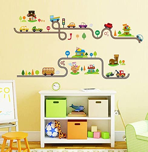 City Car Circled Curved Road Wall Stickers Decor for Children Babys Bedroom Study room – Cartoon Vehicles Wall Stickers & Traffic Street Signs Peel and Stick Removable Transportation Stickers – 2 Sheets