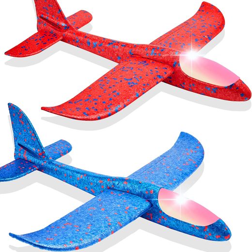 Size and quantity: Pack of 2 17.5 inch glinding foam airplane set toys with 2 different color. Two body and four wings were included in one package. It is really easy to install by just inserting the wings to the right place and start to play! Multiple flying mode: Simply insert the tail wing into two different holes to switch the flying mode of foam plane. You can choose whether the glinding mode or reverse mode by insert the wing into two different holes. Upper hole for reverse mode and bottom hole for glinding mode. Environment friendly material: Made of premium EPP material which is harmless to the human body and environment. Children can be totally safe while playing throwing foam plane because of the light wight and soft, flexiable material of the foam plane. They will not get hurt while playing them. Suitable for all ages: anyone can easily understand how to play the throwing foam gilder plane. It is a great toy for party, PE class, family activity . It will bring a lot of funs for everyone. Perfect gifts choice:LED light throwing foam plane is definitely perfect gift choice for everyone. Easy to play and have a lot of funs for paty, class or any activity. Everyone would love it if they receive them as a gift. Almost all age can enjoy the fun of it.