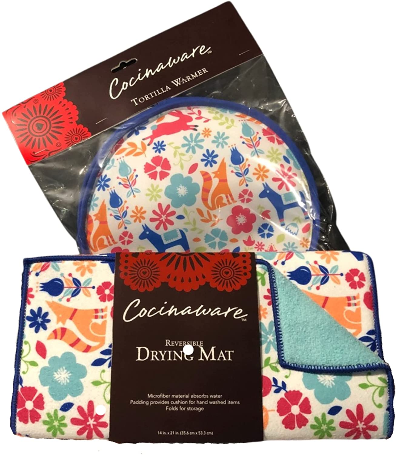 Cocinaware Matching Microwavable Tortilla Warmer and Microfiber Reversible Drying Mat Gift Set (Flowers)